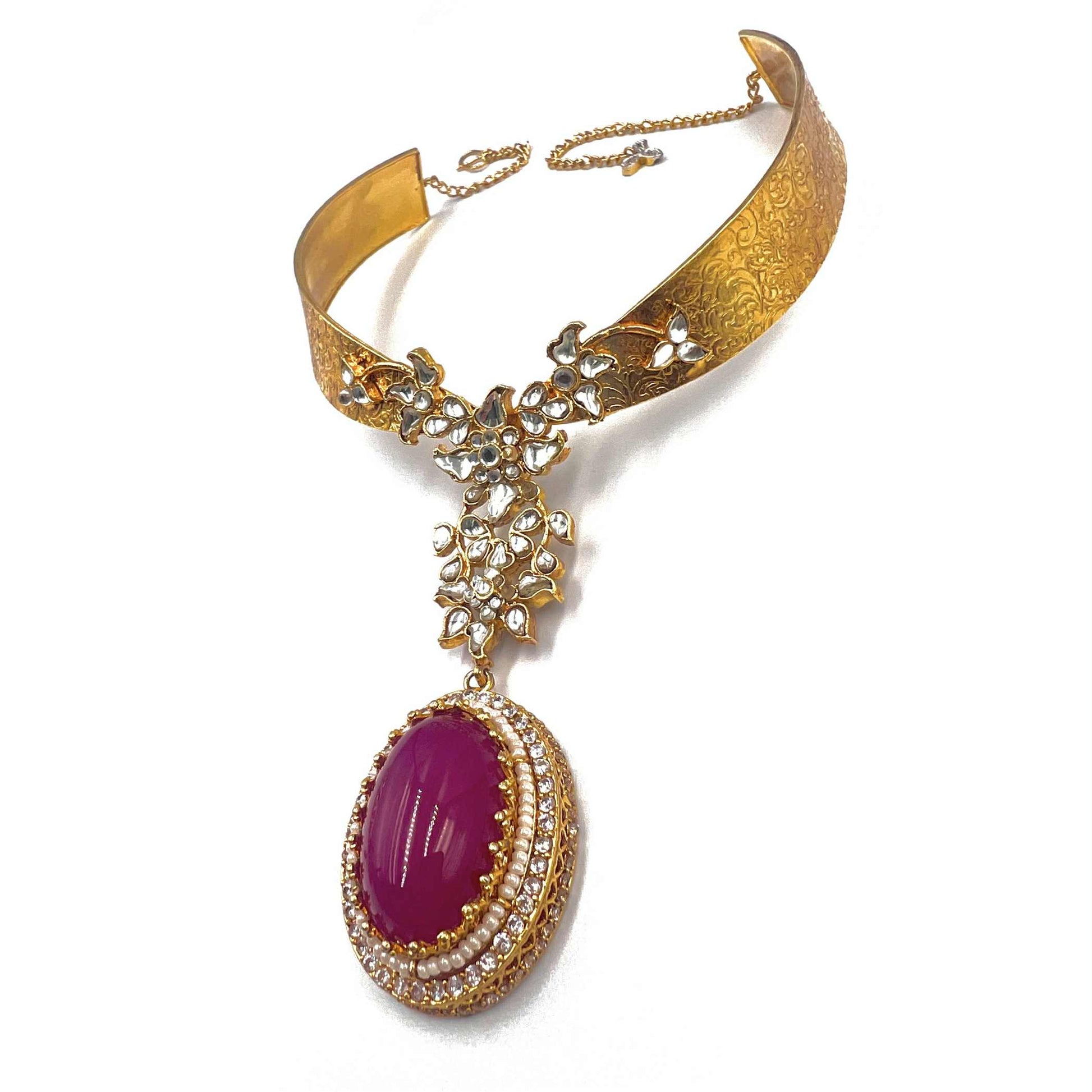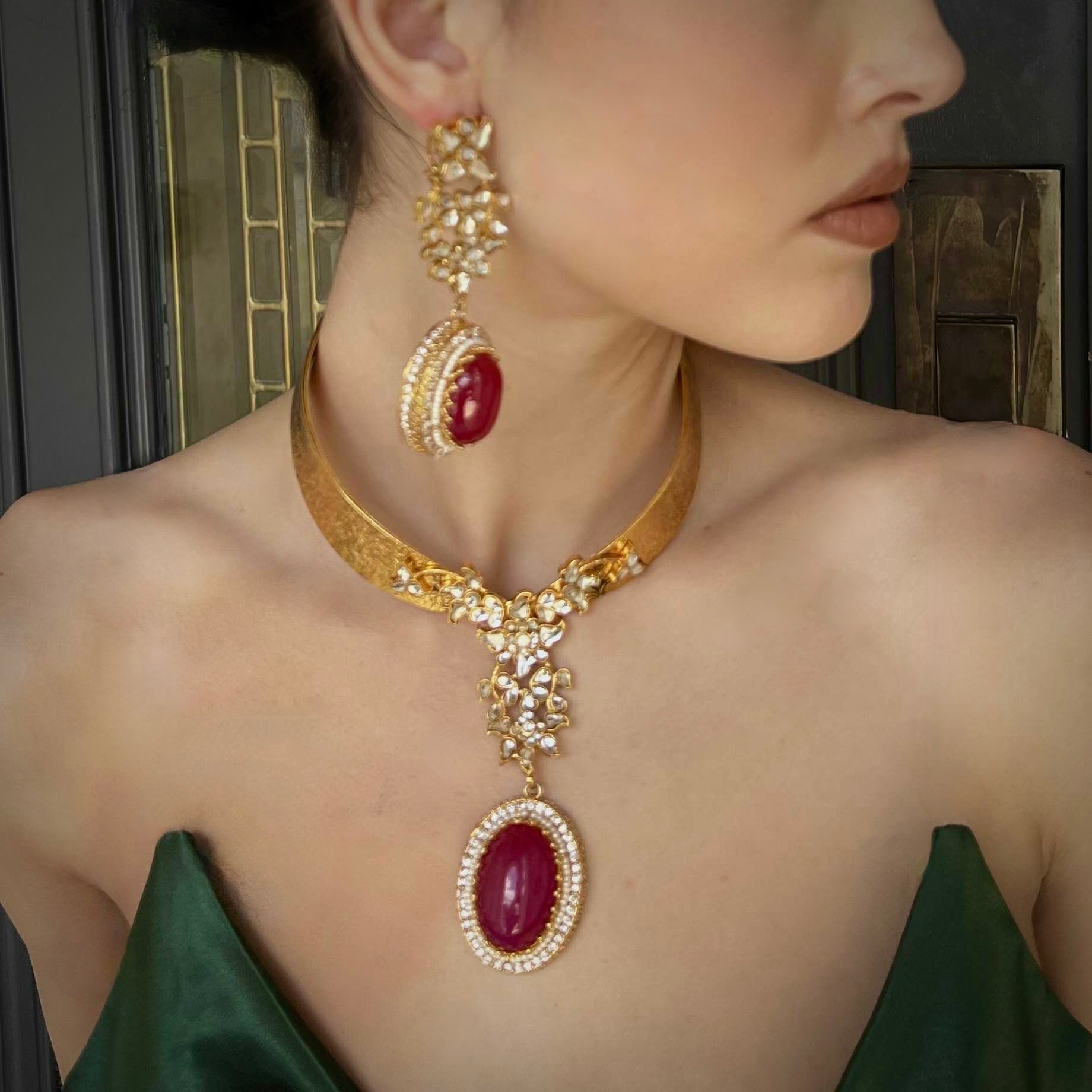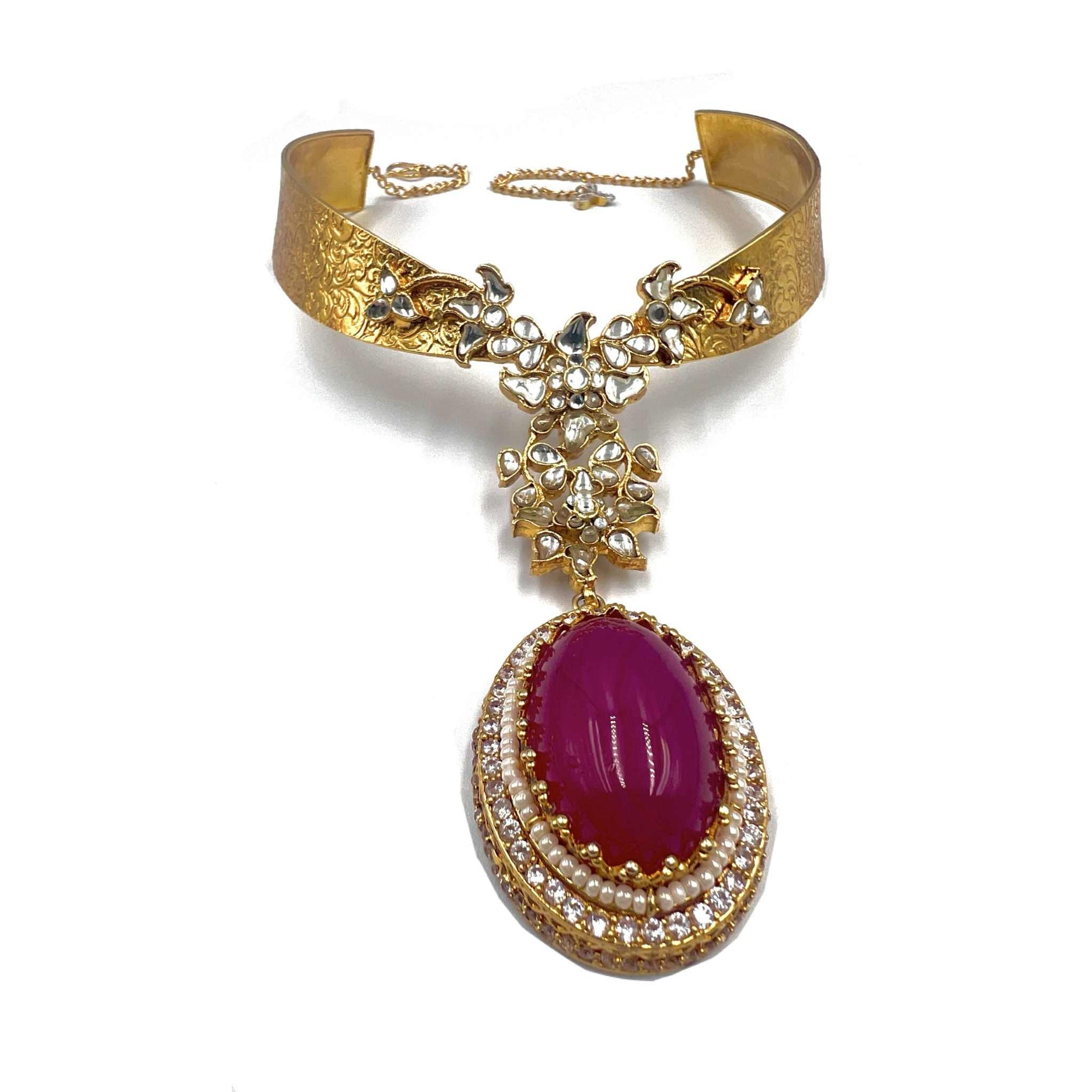 A masterpiece of timeless allure — this Hasli necklace redefines elegance with a bold, modern touch. At its center gleams a brilliant authentic Indian ruby, surrounded by hundreds of sparkling diamond Polki zircons that radiate unmatched brilliance. The intricate Kundan work woven across the Hasli adds depth and artistry, creating a piece both regal and rare.