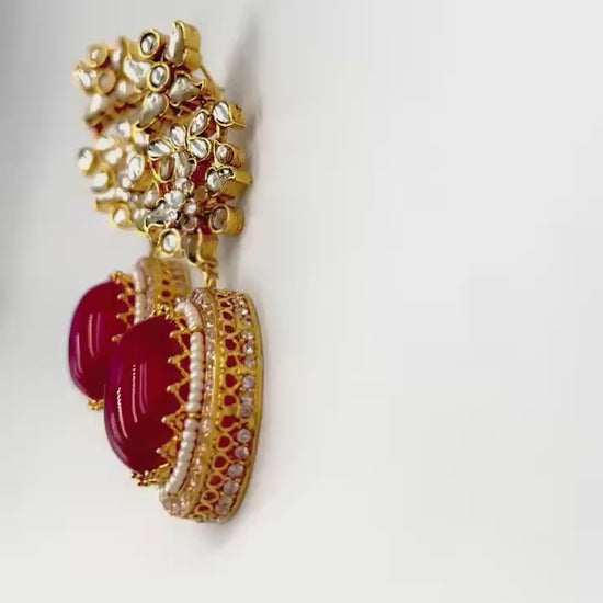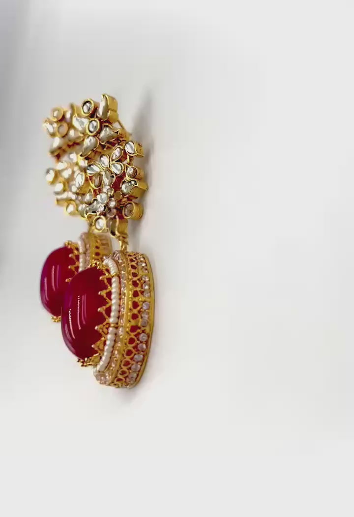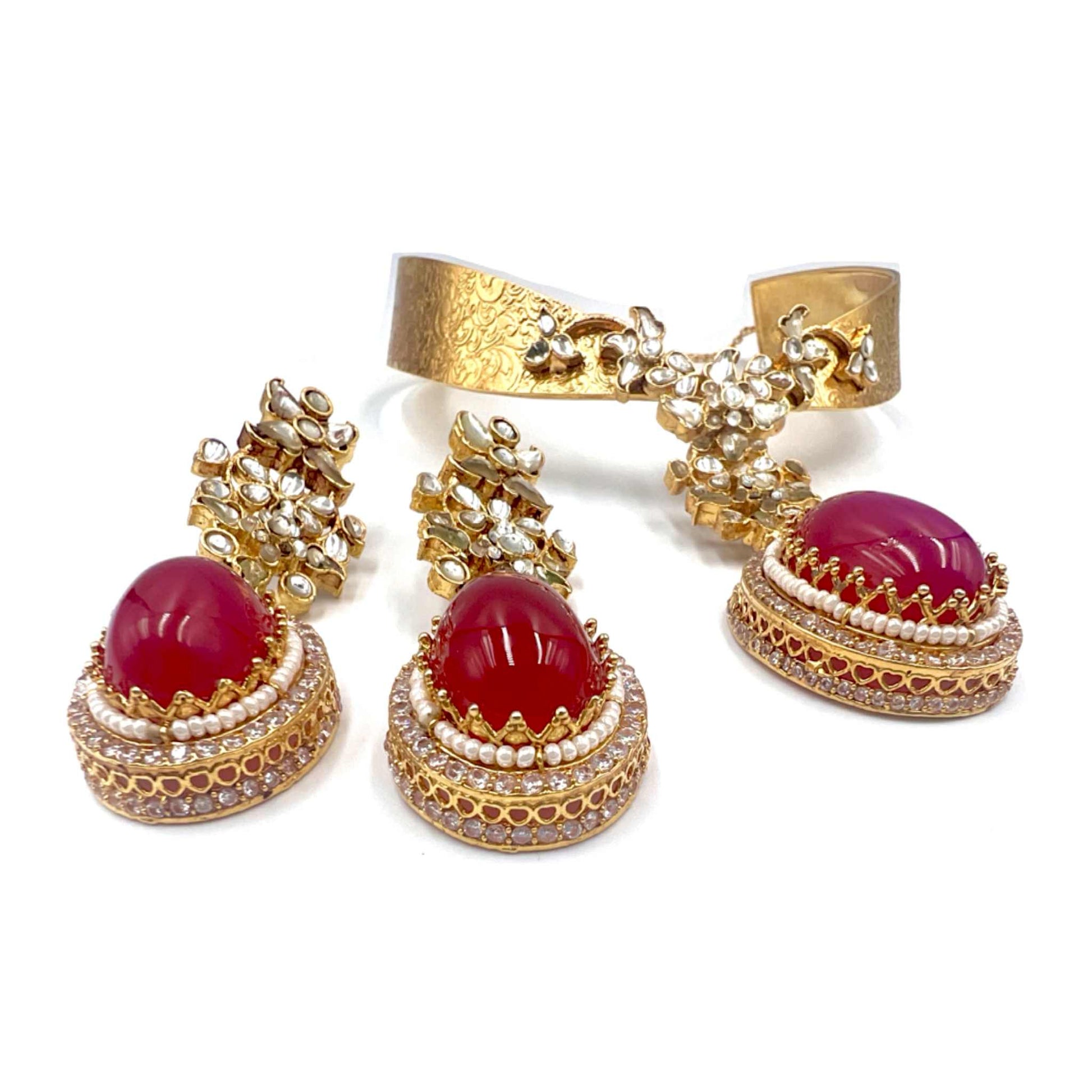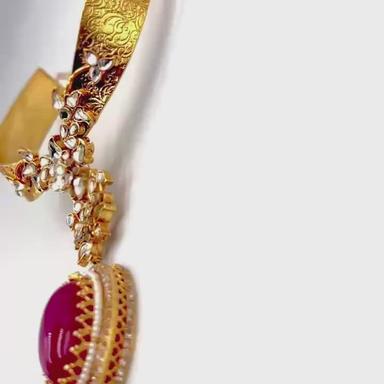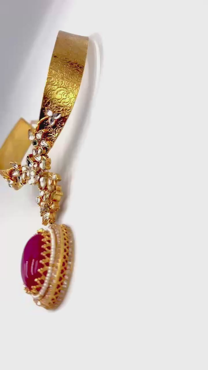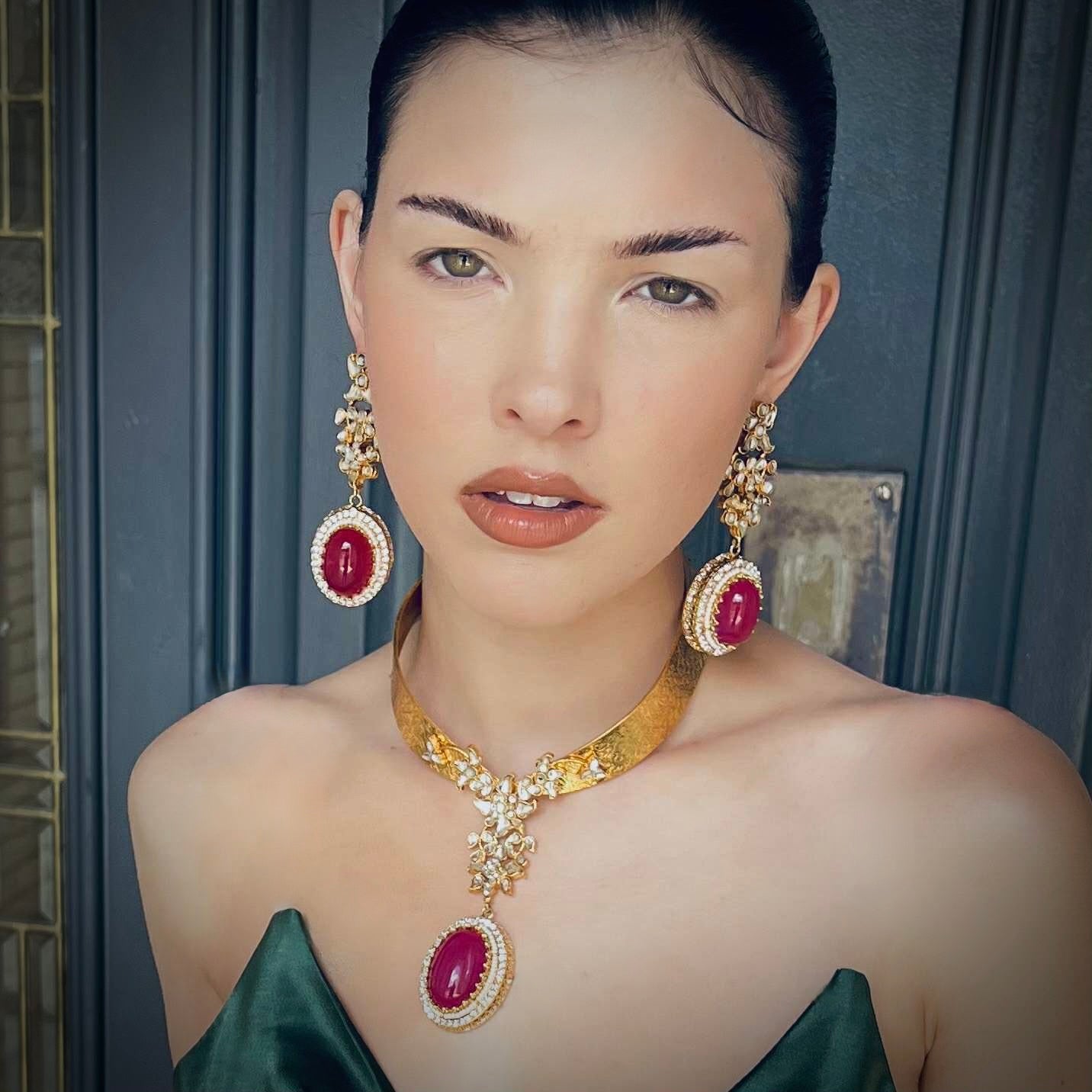 A masterpiece of timeless allure — this Hasli necklace redefines elegance with a bold, modern touch. At its center gleams a brilliant authentic Indian ruby, surrounded by hundreds of sparkling diamond Polki zircons that radiate unmatched brilliance. The intricate Kundan work woven across the Hasli adds depth and artistry, creating a piece both regal and rare.