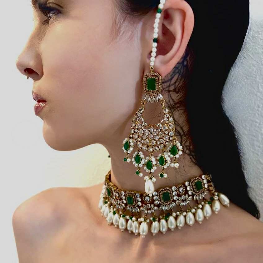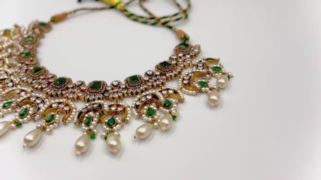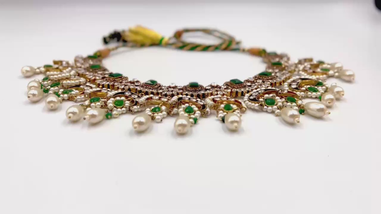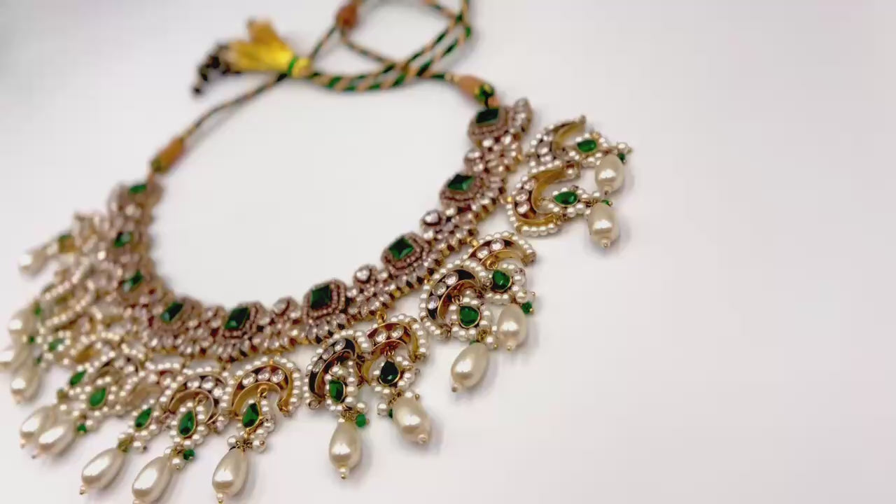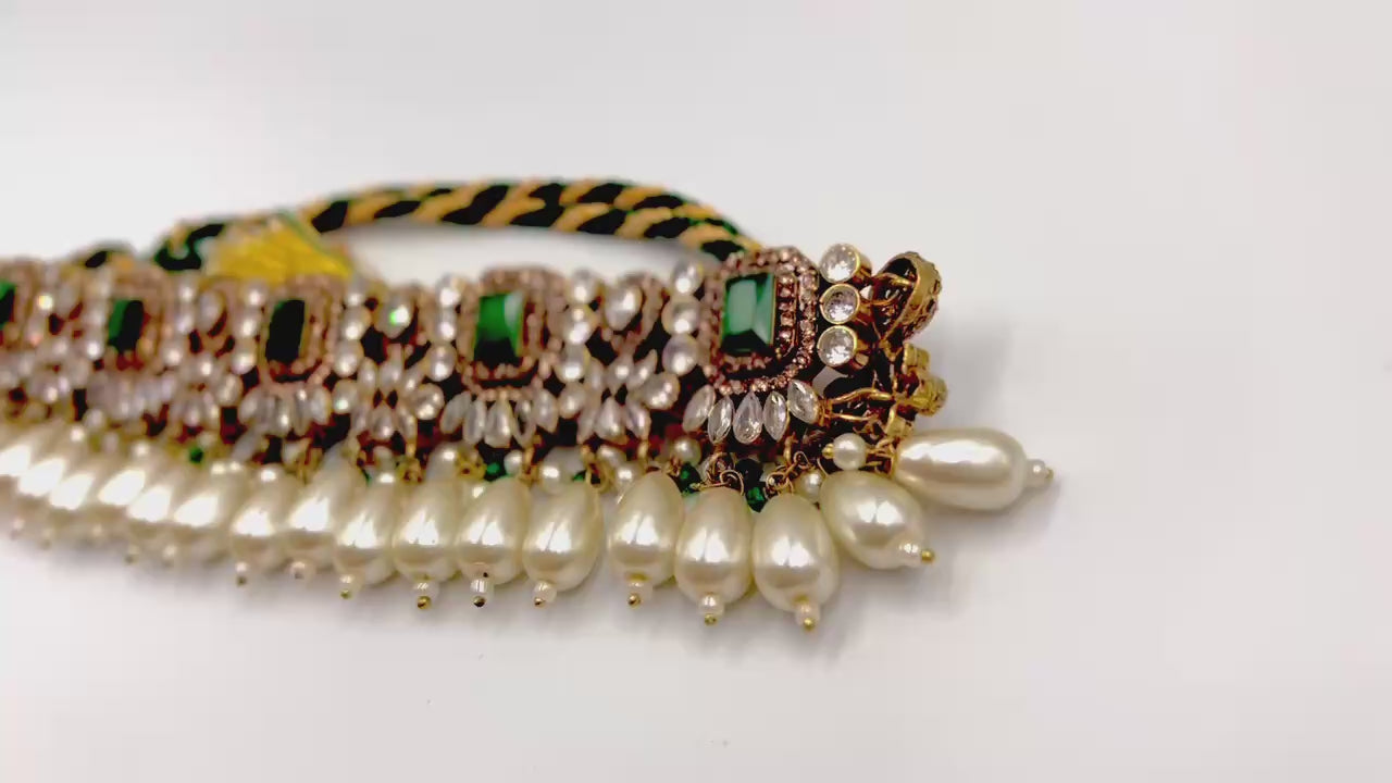 A masterpiece of timeless allure — this breathtaking Jarao bridal set is the epitome of regal elegance. Handcrafted to perfection, it features a choker and necklace that gracefully embrace every curve of your neckline, as if sculpted just for you. Adorned with Indian emeralds, diamond Polki zircons, and teardrop creamy pearls, each piece catches the light with a mesmerizing shimmer. The set includes a teeka, jhoomer, choker, necklace, and lightweight earrings, designed to be worn together for a dazzling bridal statement or separately for refined grace. Intricate, delicate, and radiant — this is not just jewelry, it’s artistry in motion, made to illuminate every moment you wear it.