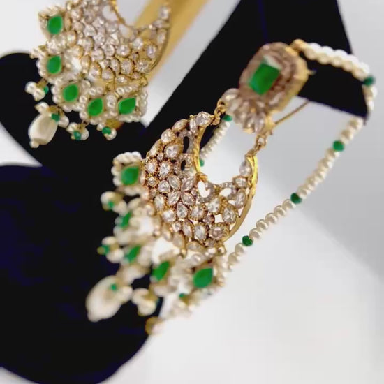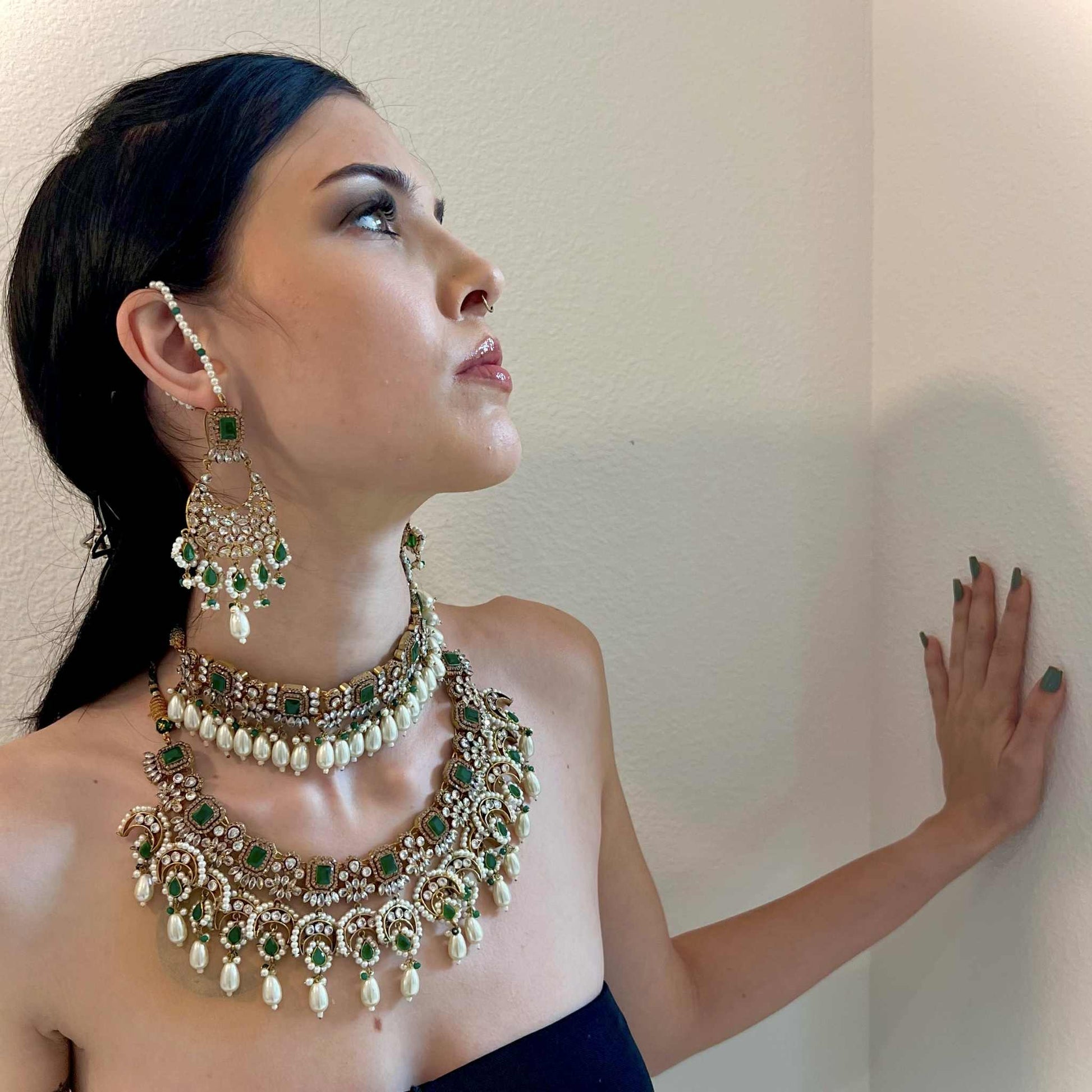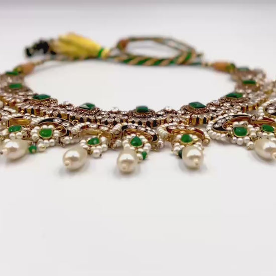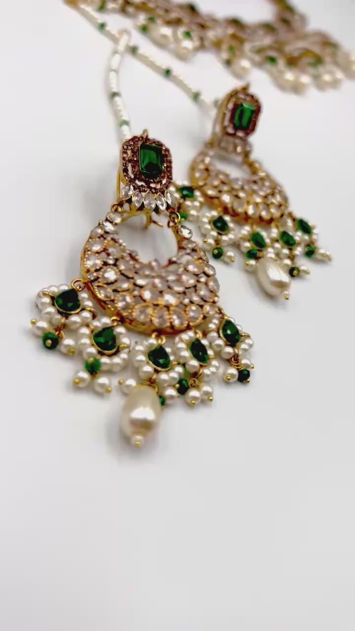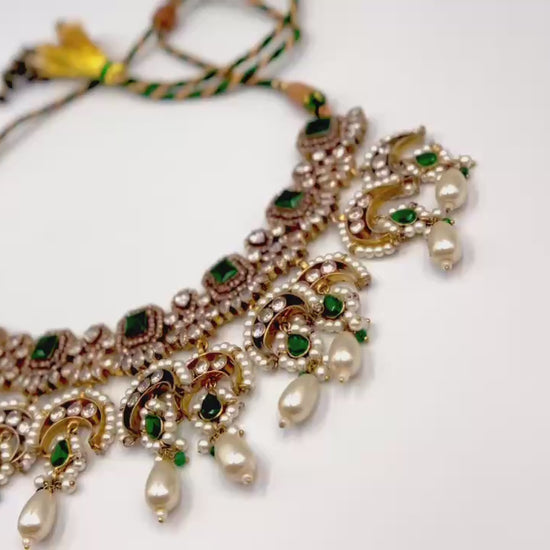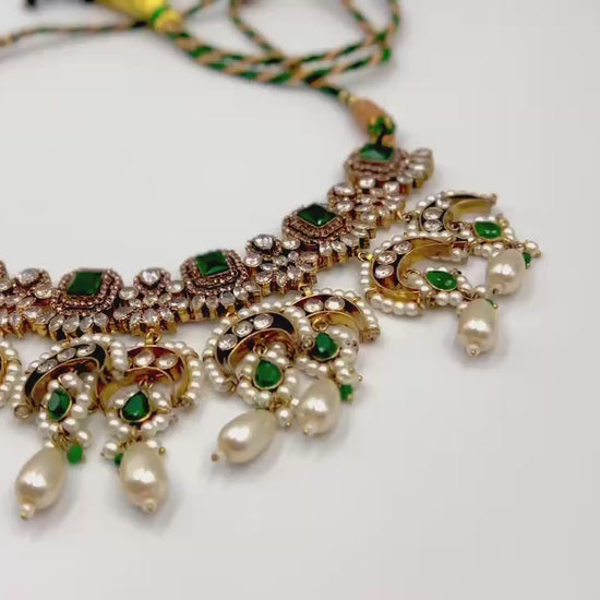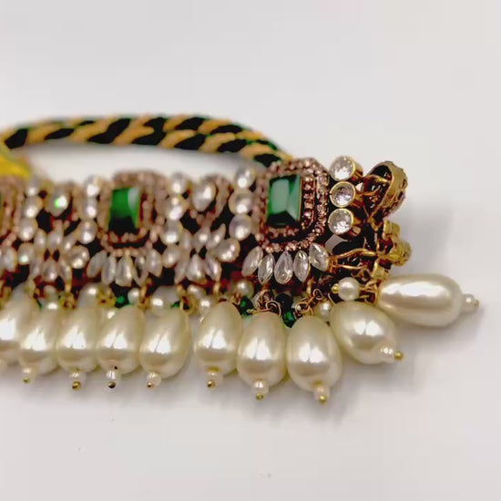 A masterpiece of timeless allure — this breathtaking Jarao bridal set is the epitome of regal elegance. Handcrafted to perfection, it features a choker and necklace that gracefully embrace every curve of your neckline, as if sculpted just for you. Adorned with Indian emeralds, diamond Polki zircons, and teardrop creamy pearls, each piece catches the light with a mesmerizing shimmer. The set includes a teeka, jhoomer, choker, necklace, and lightweight earrings, designed to be worn together for a dazzling bridal statement or separately for refined grace. Intricate, delicate, and radiant — this is not just jewelry, it’s artistry in motion, made to illuminate every moment you wear it.