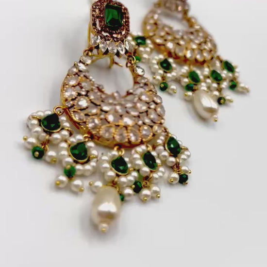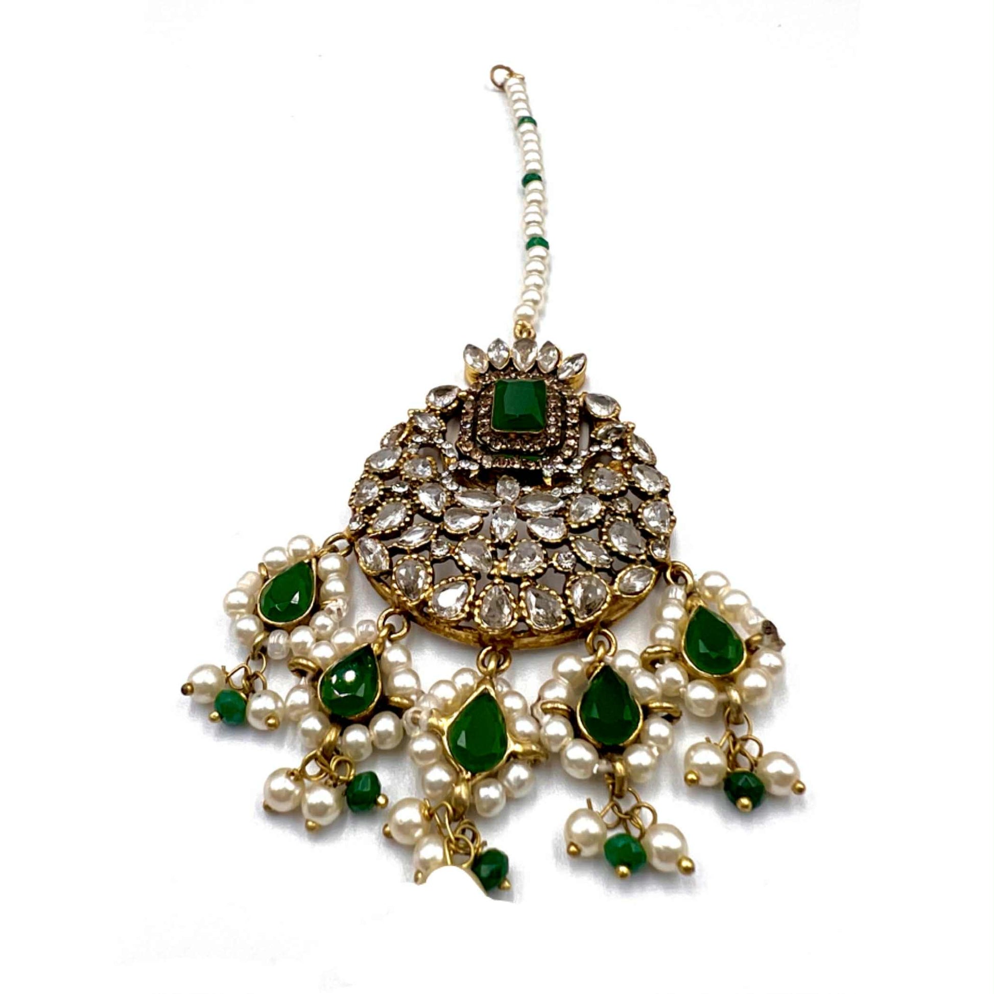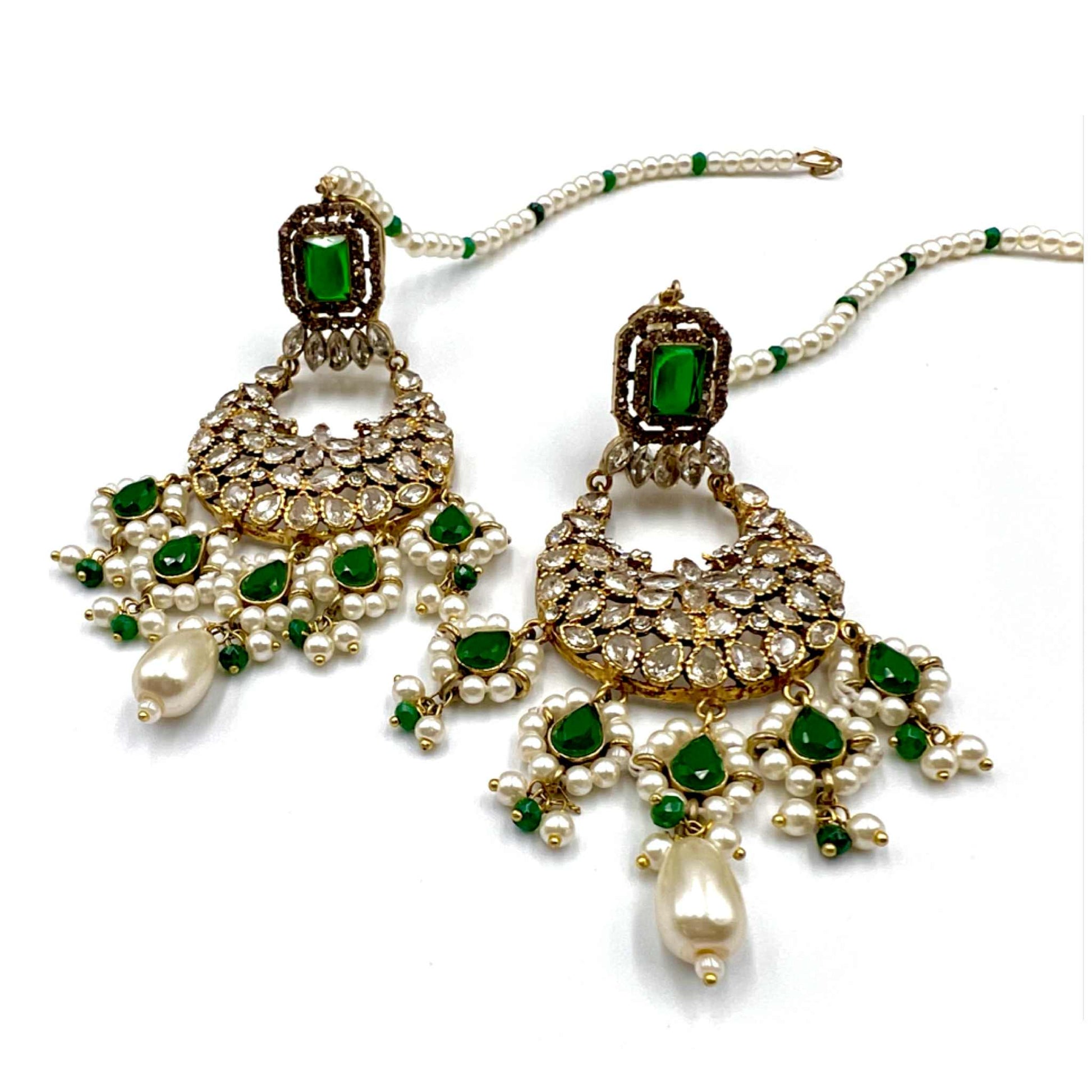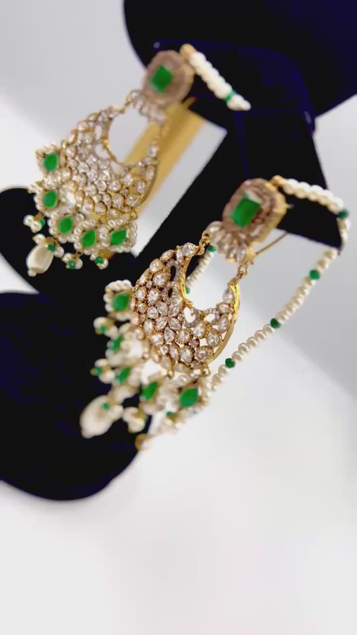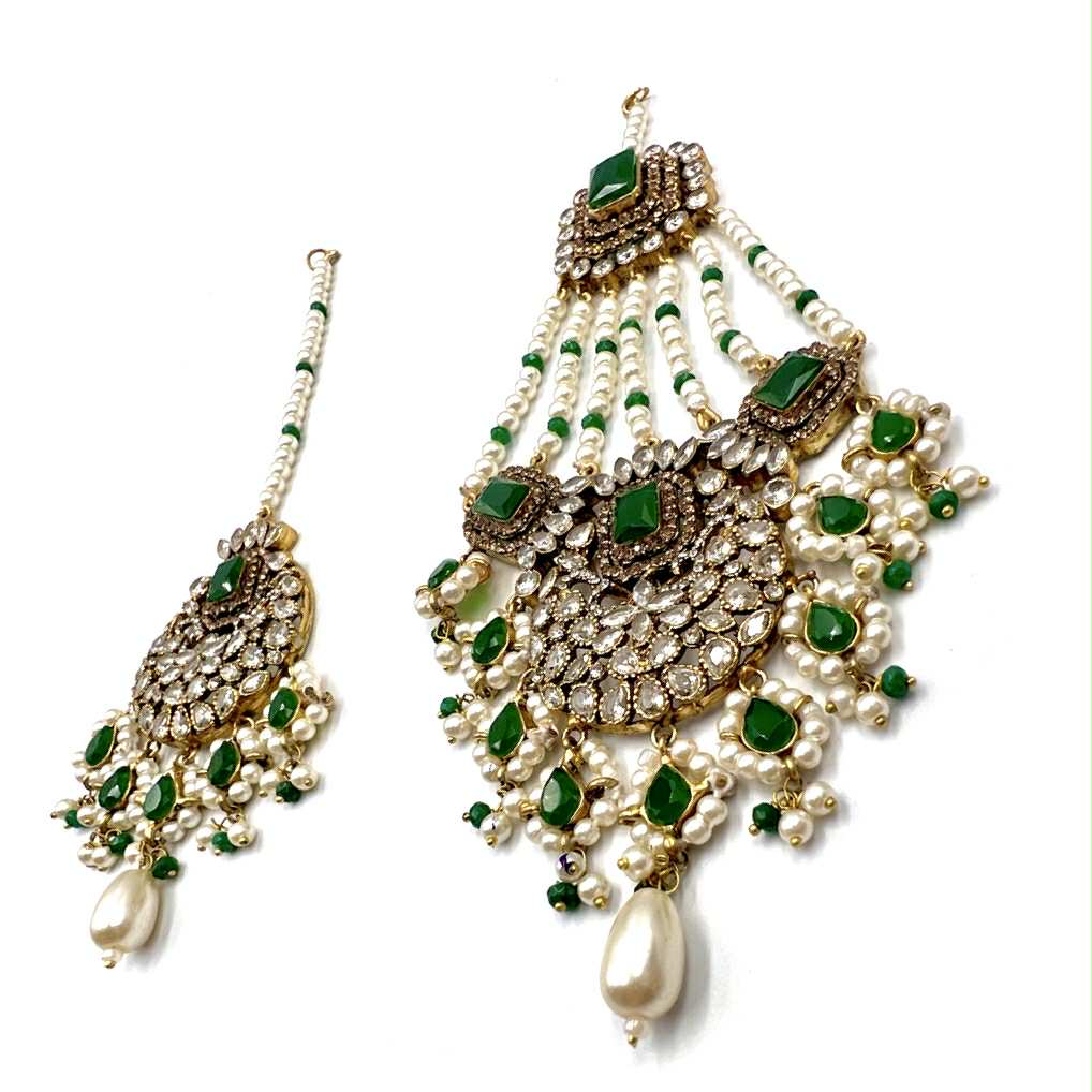 A masterpiece of timeless allure — this breathtaking Jarao bridal set is the epitome of regal elegance. Handcrafted to perfection, it features a choker and necklace that gracefully embrace every curve of your neckline, as if sculpted just for you. Adorned with Indian emeralds, diamond Polki zircons, and teardrop creamy pearls, each piece catches the light with a mesmerizing shimmer. The set includes a teeka, jhoomer, choker, necklace, and lightweight earrings, designed to be worn together for a dazzling bridal statement or separately for refined grace. Intricate, delicate, and radiant — this is not just jewelry, it’s artistry in motion, made to illuminate every moment you wear it.