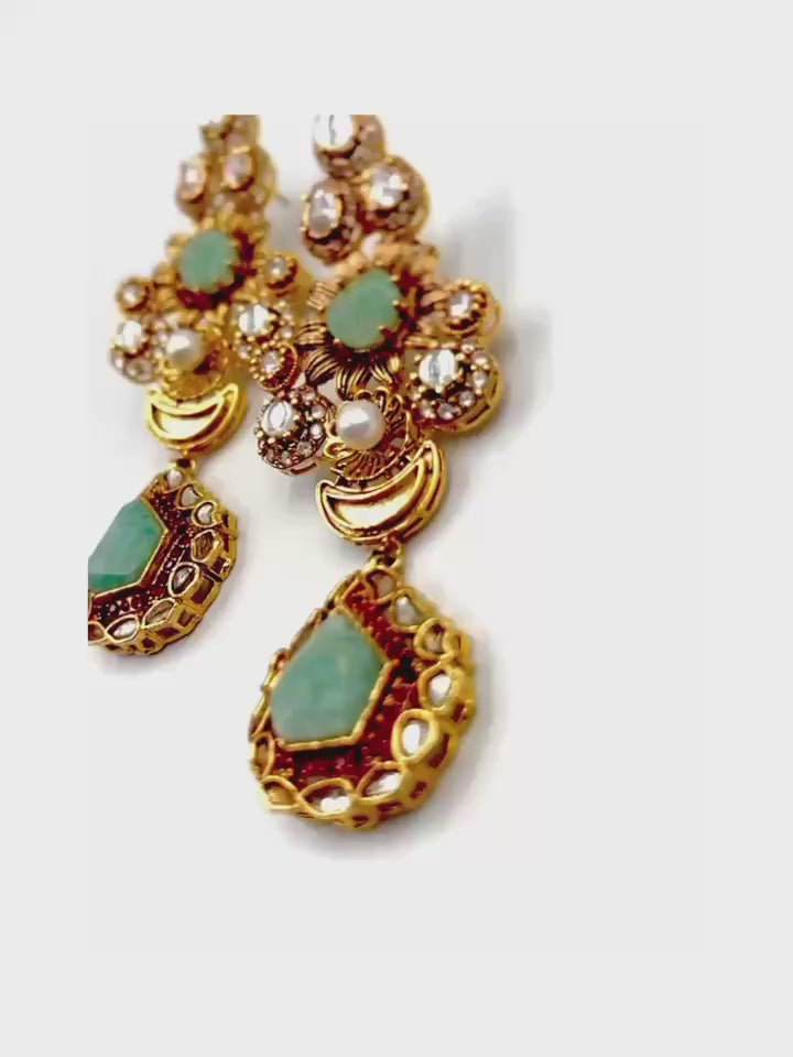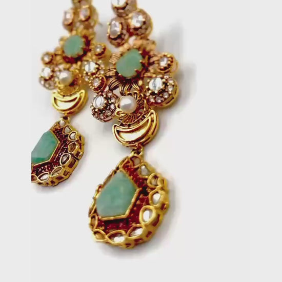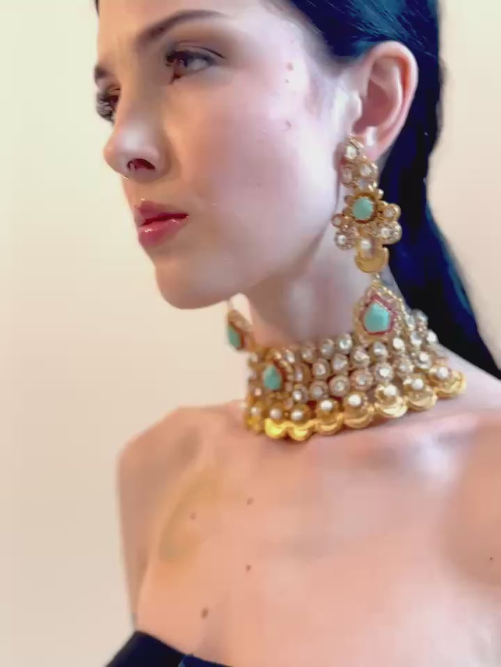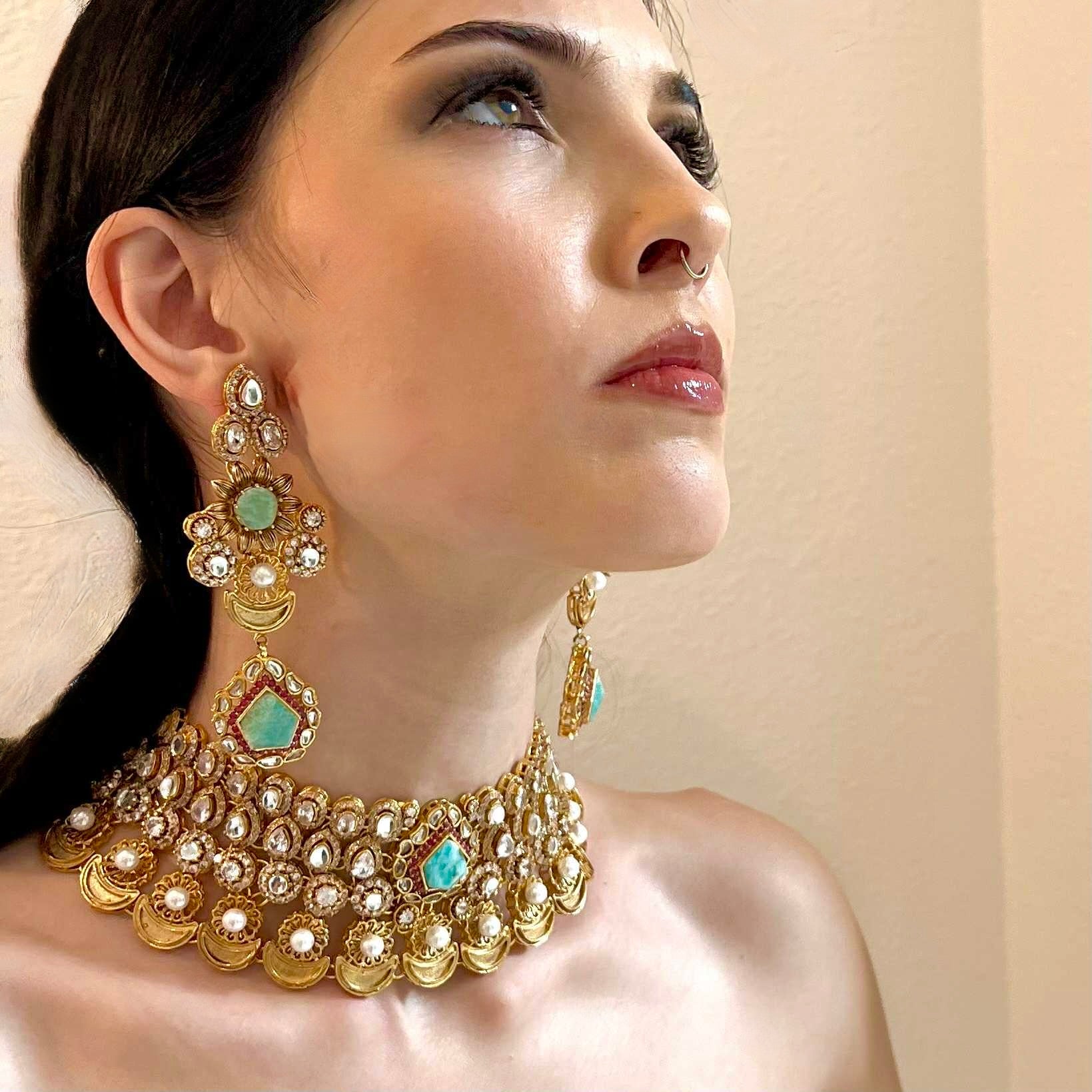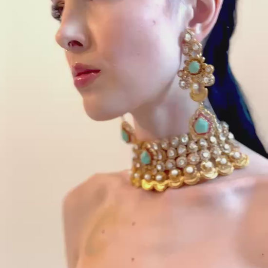 A timeless expression of elegance — this exquisite Jarao bridal set defines sophistication and grace. Designed to be worn as both a choker and a necklace, it drapes the neckline with regal allure. Featuring hand-cut teardrop diamond Polkis, luminous Kundan, and an authentic raw Feroza center stone, it captivates with depth and radiance. The assorted Polki sizes and a subtle touch of Indian rubies around the Feroza create a uniquely enchanting contrast, making this piece truly unforgettable. Paired with its teeka and lightweight earrings, it’s a vision of intricate beauty and timeless luxury