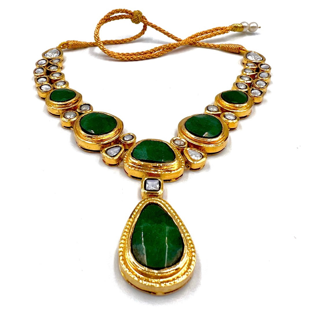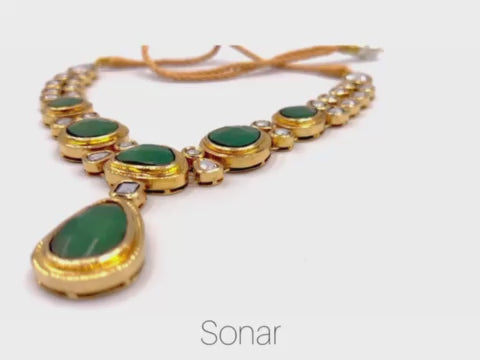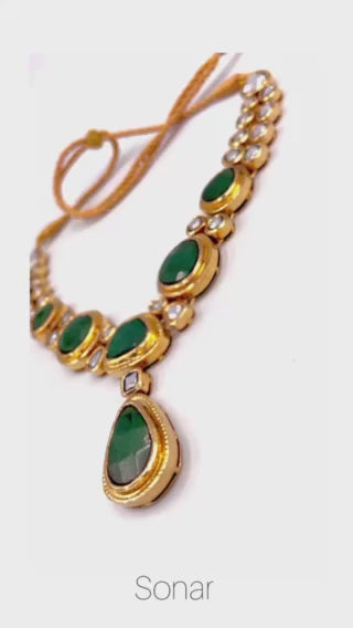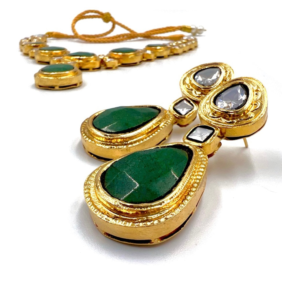 Experience true magnificence with this gold-plated set that surpasses even the splendor of Mughal jewels. From the radiant sparkle of its Polki stones to the expertly hand-crafted details, it stands as the embodiment of sheer luxury. Envision it personalized with your chosen regal stone – a touch of majesty crafted exclusively for you. And when it comes to the earrings, let us design them to your desire: bold or delicate, traditional or modern, we're here to bring your vision to reality.