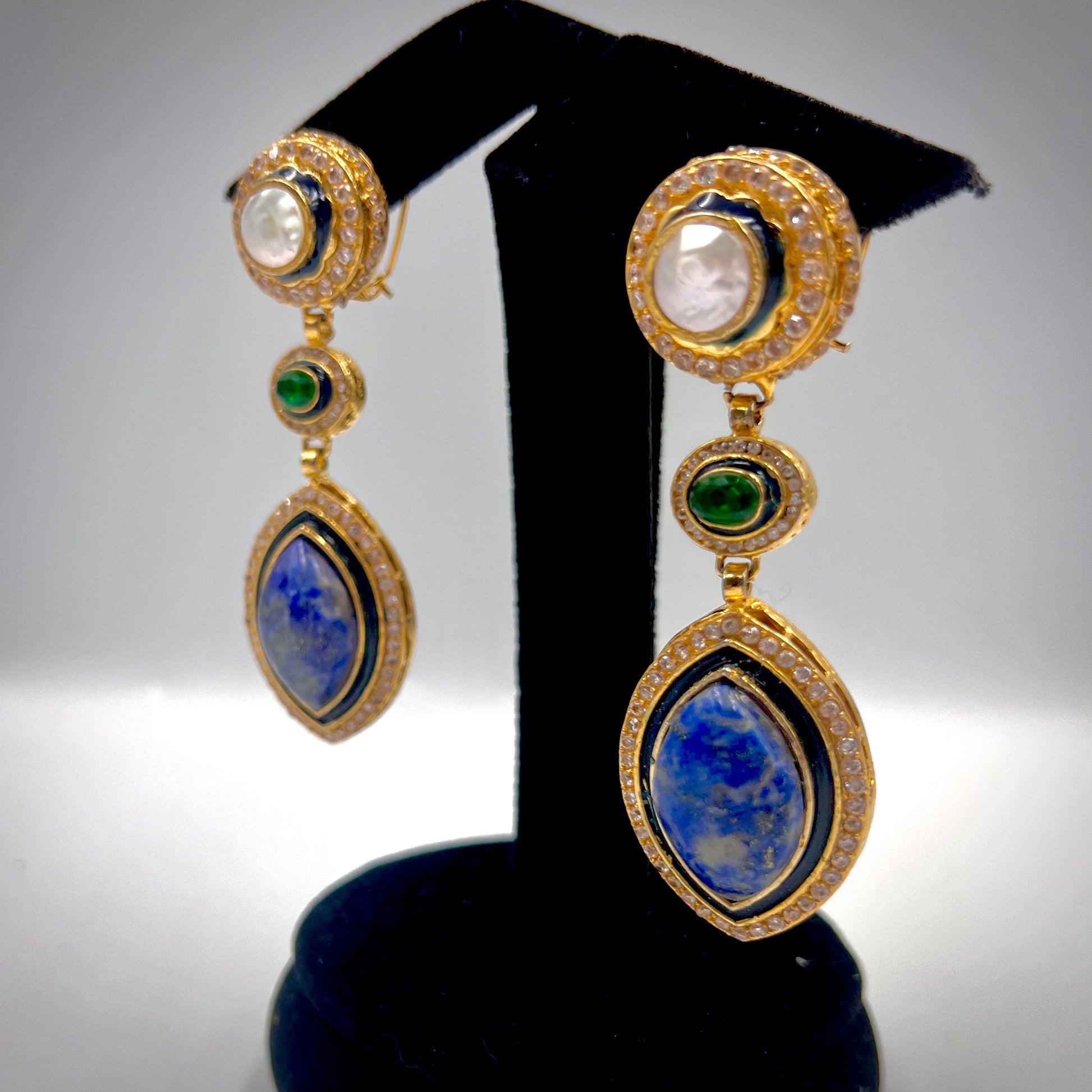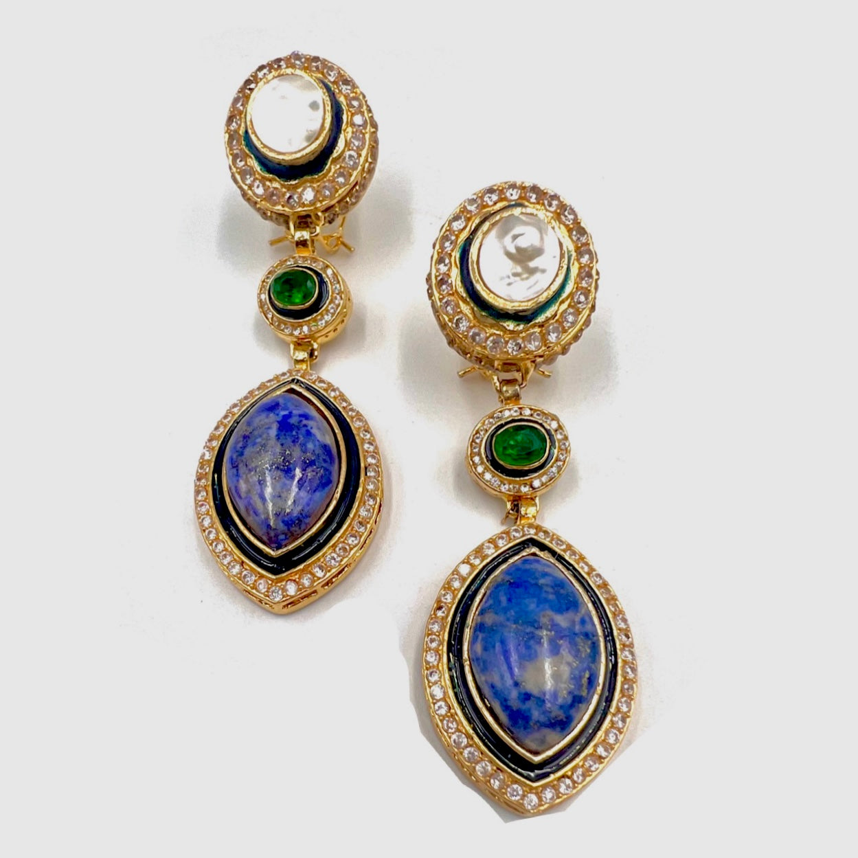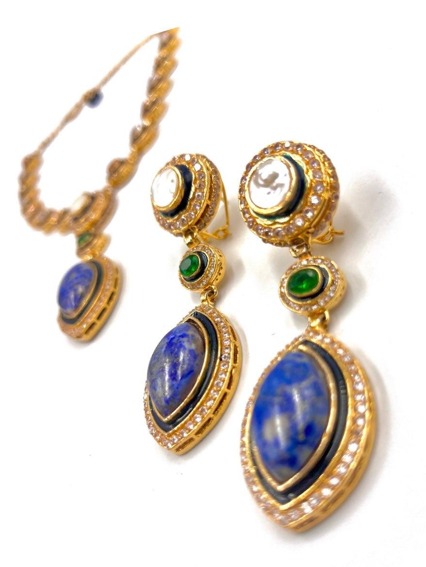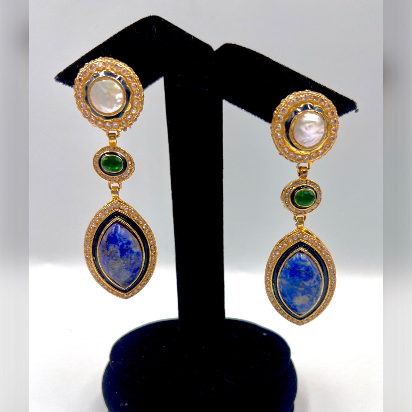 Step into a world of unparalleled elegance with our mesmerizing earrings. Crafted to perfection, each piece showcases the epitome of luxury and sophistication. From the radiant Golden Topaz to the majestic lapis lazuli, every stone shines brilliantly, complemented by custom-cut Zircons for added allure. With the final touch of Black Meena, these earrings exude drama and refinement, making them a must-have for those who crave the extraordinary.