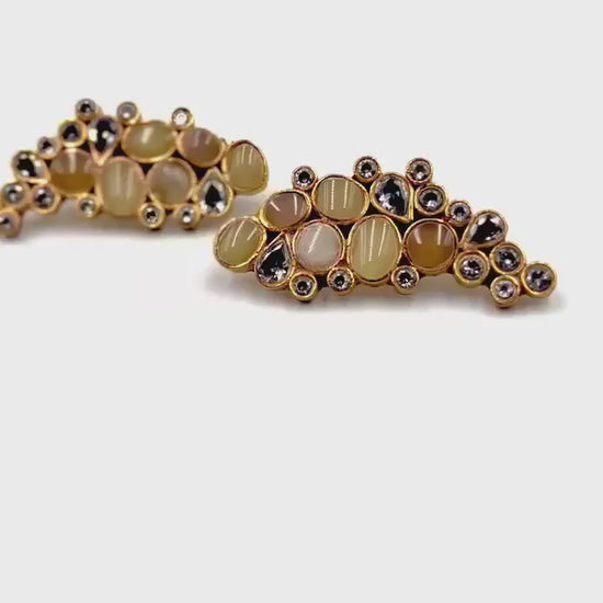 Radiating with the timeless elegance of Polki and the rich, captivating hues of Aqiq, these earrings are the perfect blend of tradition and modern flair. Each stone sparkles with luxurious charm, effortlessly enhancing any ensemble—whether wrapped in eastern grace or western sophistication. A pair so enchanting, it feels as if you're wearing a touch of magic itself