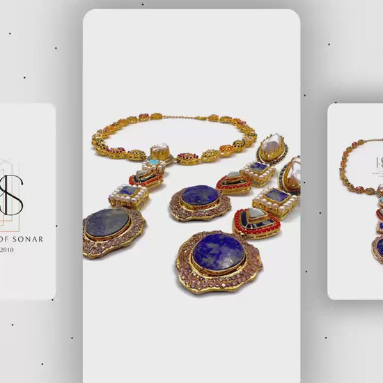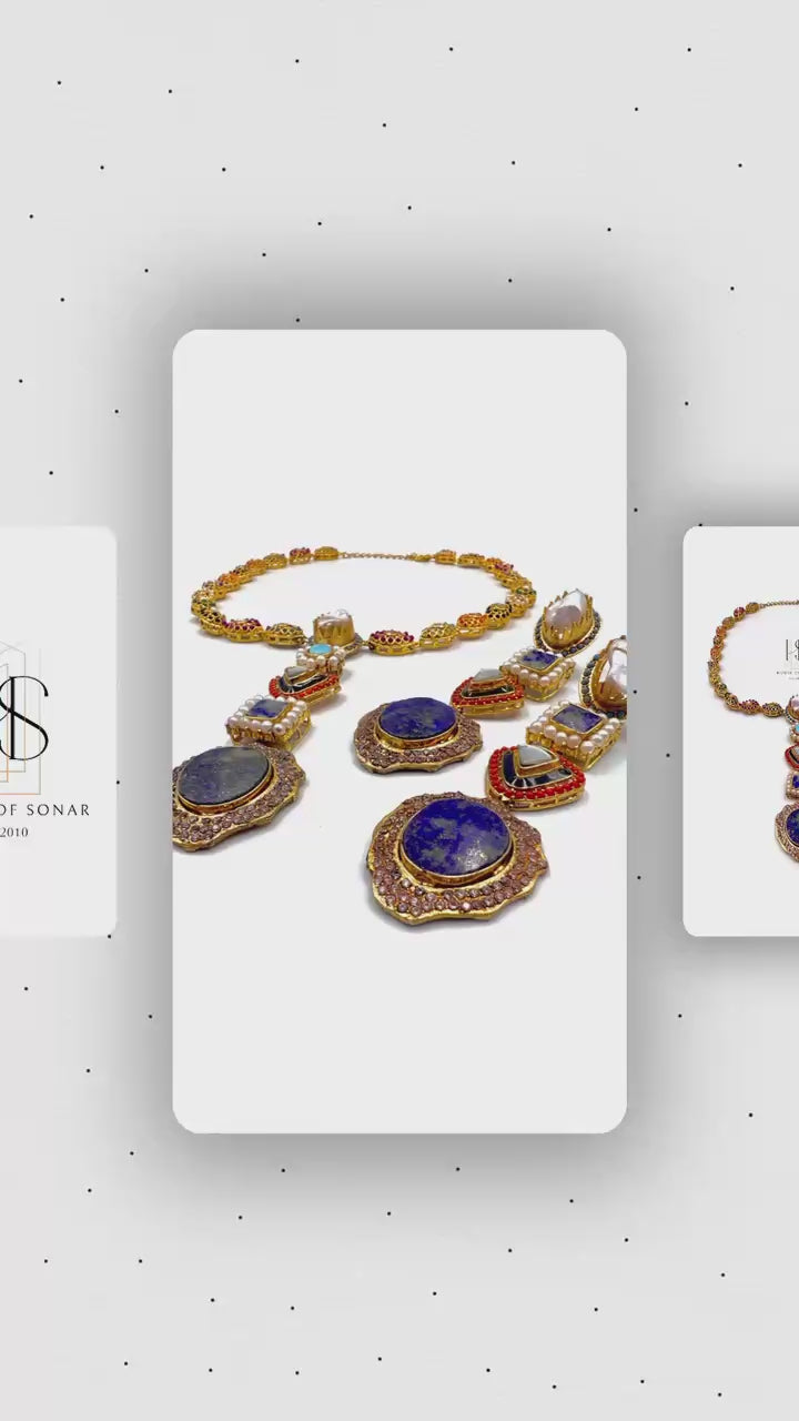 Bathed in the deep celestial glow of authentic Lapis Lazuli, this set dazzles with raw pearl nuggets, fiery corals, and the mystique of Navratan gemstones. Every gem whispers a tale of royalty, grandeur, and timeless allure.